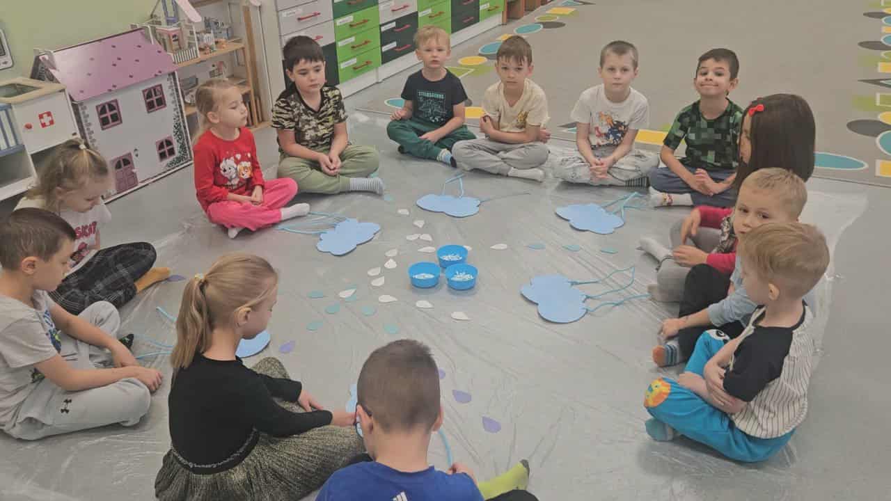 Na zajęciach w ramach innowacji pedagogicznej „Sensoryczna przygoda w Krainie Radości”, Żabki ćwiczyły małą motorykę poprzez nawlekanie pociętych słomek na druciki kreatywne, tworząc przy tym deszczowe chmury. Podczas pracy zespołowej dopasowywały również odpowiednie elementy do parasola według wzoru. Doskonaliły przy tym logiczne myślenie i umiejętność odwzorowywania. Nie zabrakło eksperymentu „Deszczowa chmura” w trakcie którego przedszkolaki tworzyły własne chmury w słoiku poprzez zakraplanie pipetą niebieskiej farby na piankę do golenia. Na zakończenie wykonały kolorowe parasole, wyklejając je zabarwionym ryżem. Stworzyły na obrazku także kałuże i deszcz podczas ćwiczeń oddechowych, polegających na rozdmuchiwaniu przez słomkę niebieskiej farby na kartce papieru.