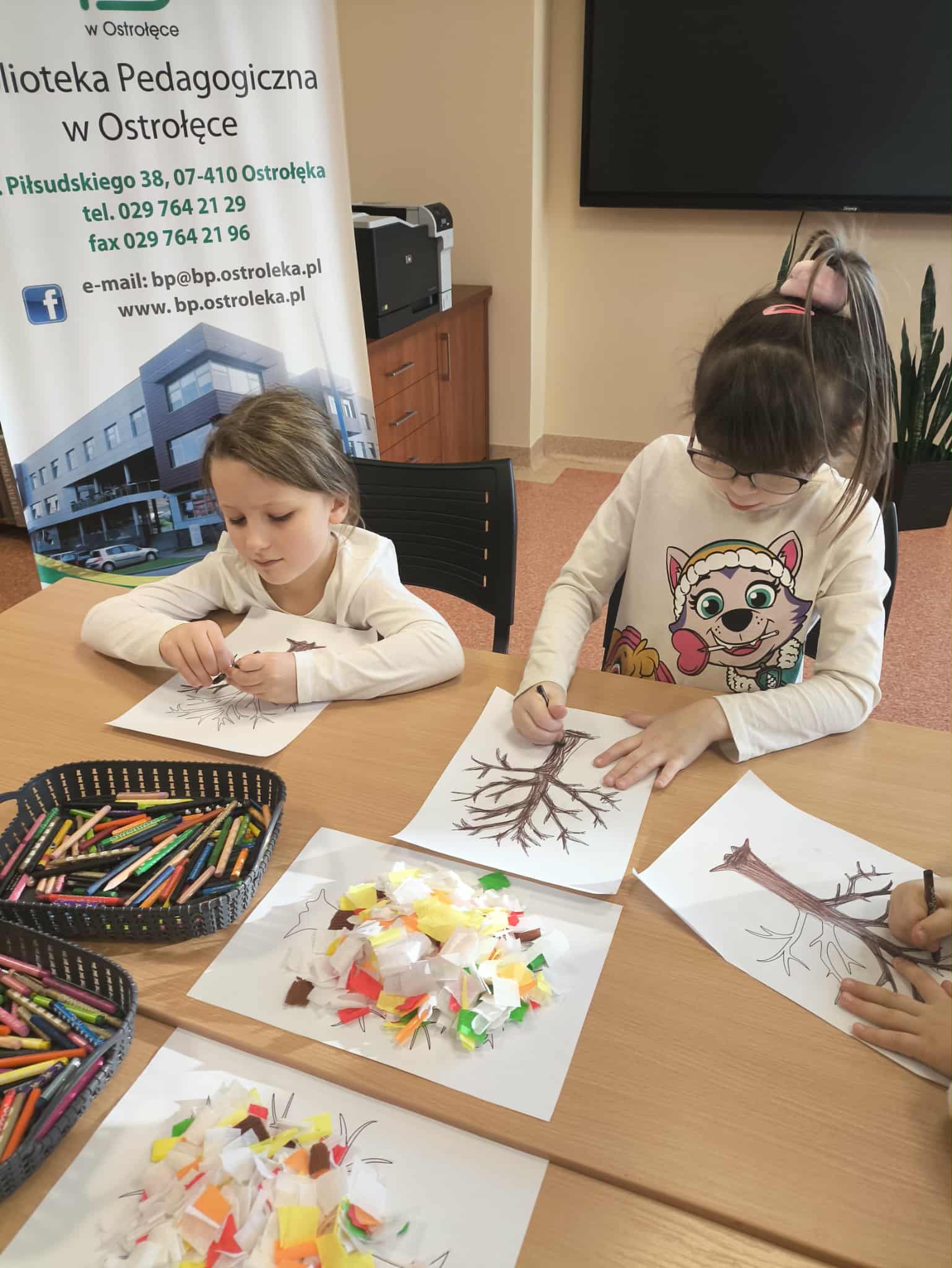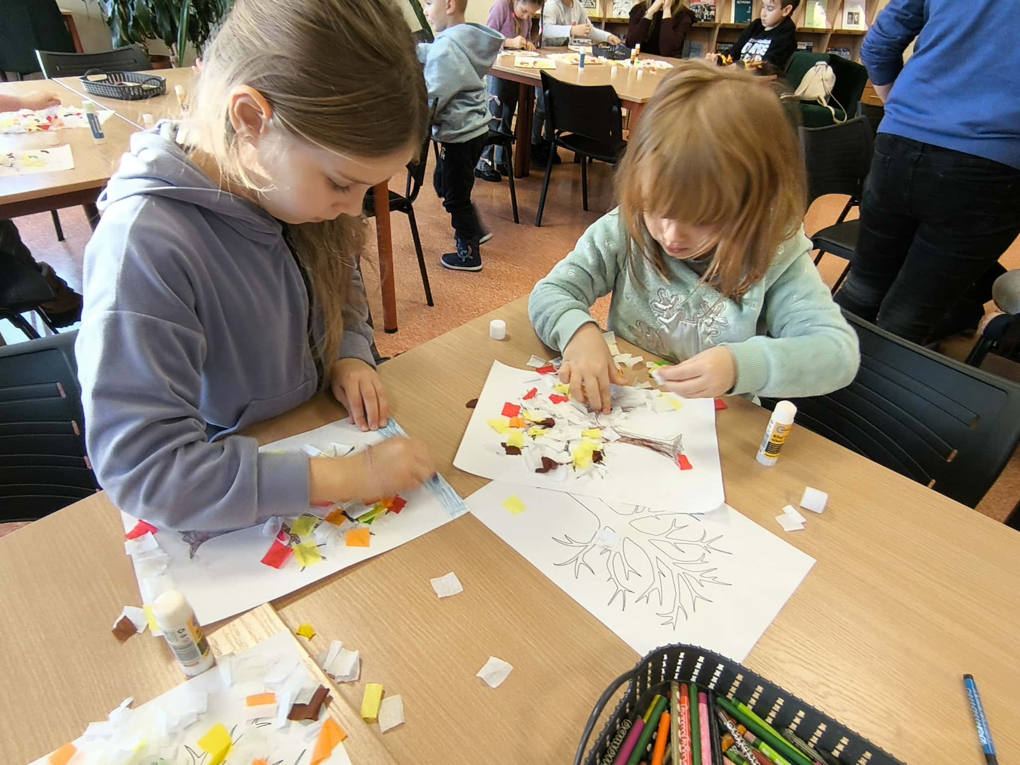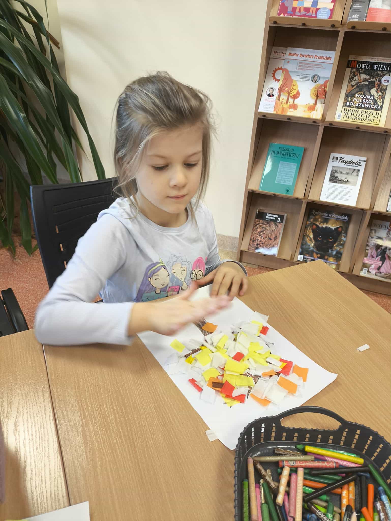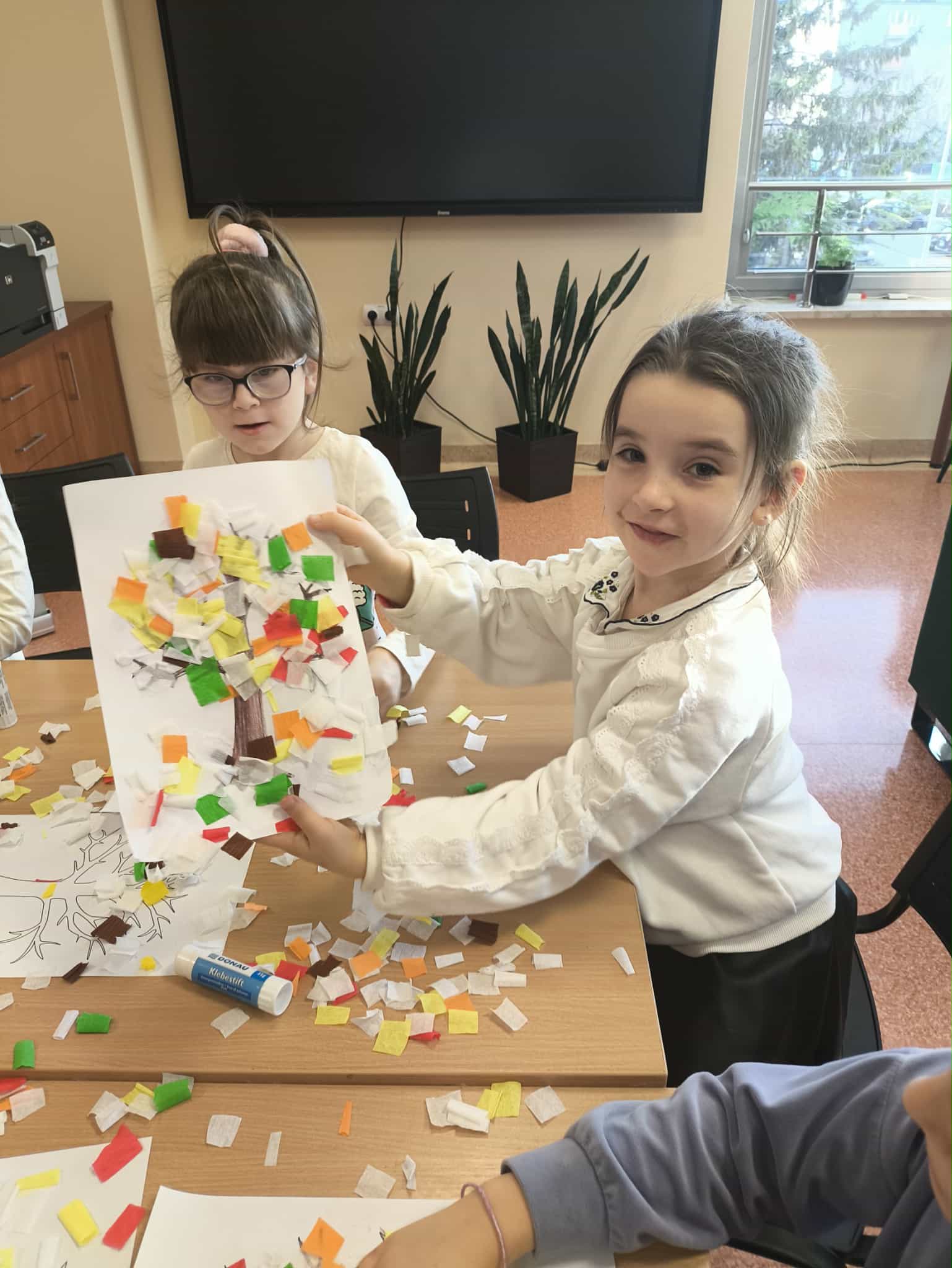 Po wysłuchaniu historii wykonały jesienną pracę plastyczną, tworząc kolorowe kompozycje zainspirowane aktualną porą roku. Każda praca była inna – pełna kreatywności, wyobraźni i jesiennych kolorów. Wizyta była ciekawym doświadczeniem, łączącym naukę, sztukę i dobrą zabawę.